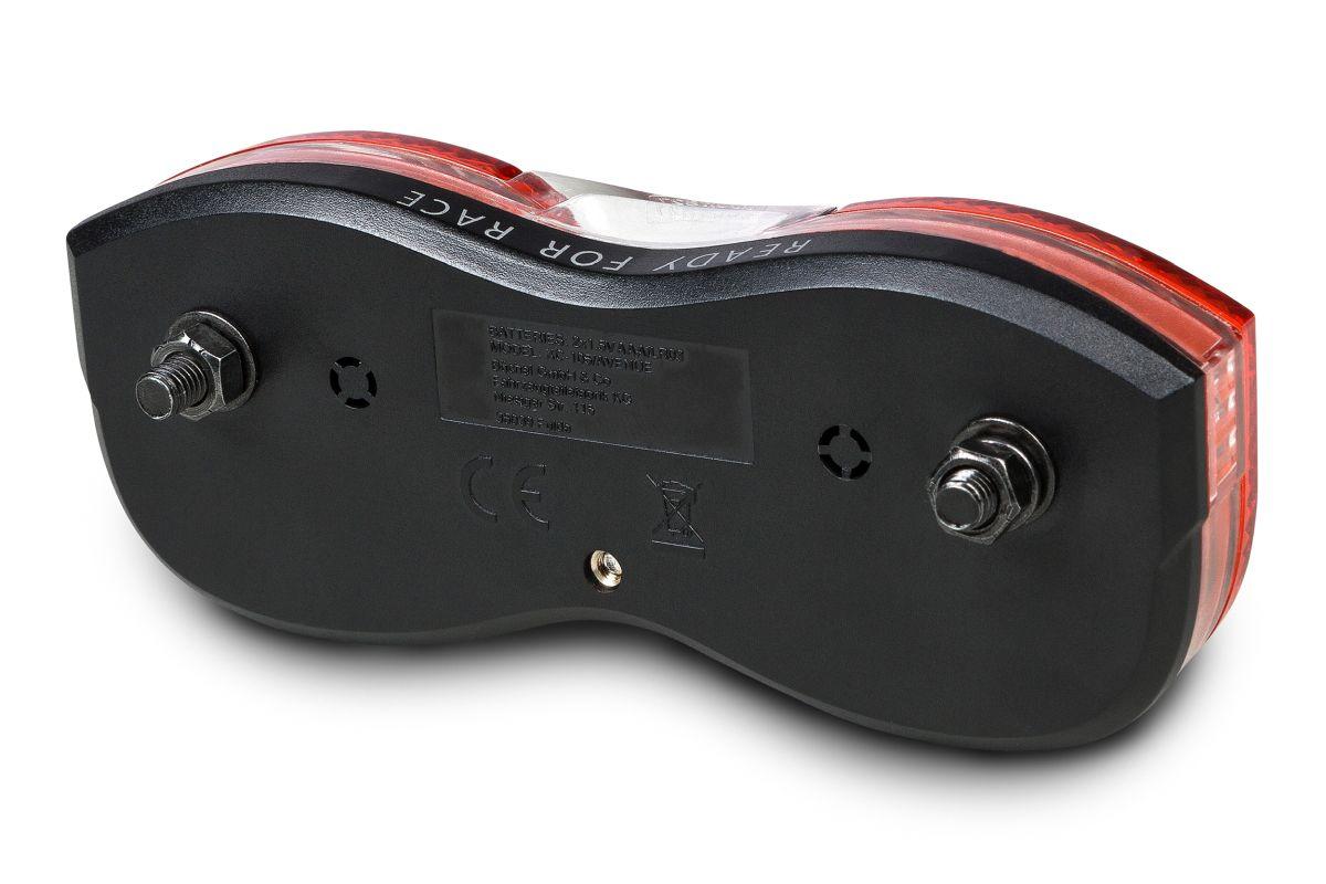 Beste Beleuchtung, auch hinten! Spritzwassergeschütztes Rücklicht mit StVZO Zulassung, das für Gepäckträger geeignet ist. 80 mm Abstand und 3 LEDs. Batterien sind inklusive.